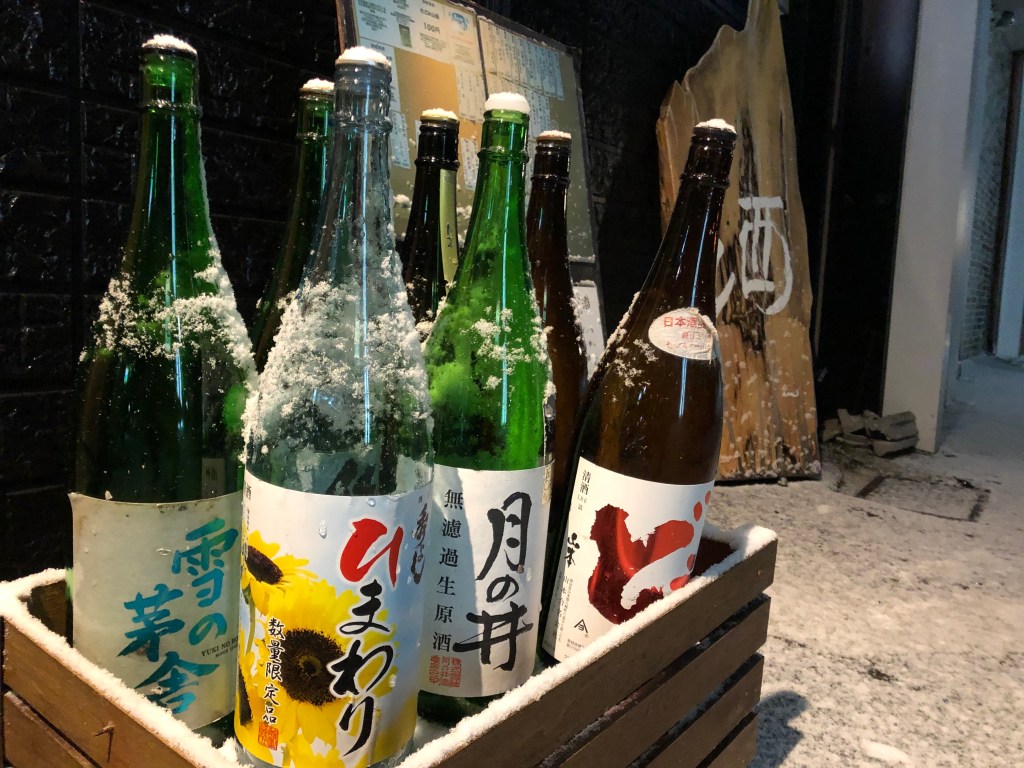 Snow dusted sake bottles in Misawa. Misawa, Japan. 2020. Photo by Greg Vessar.