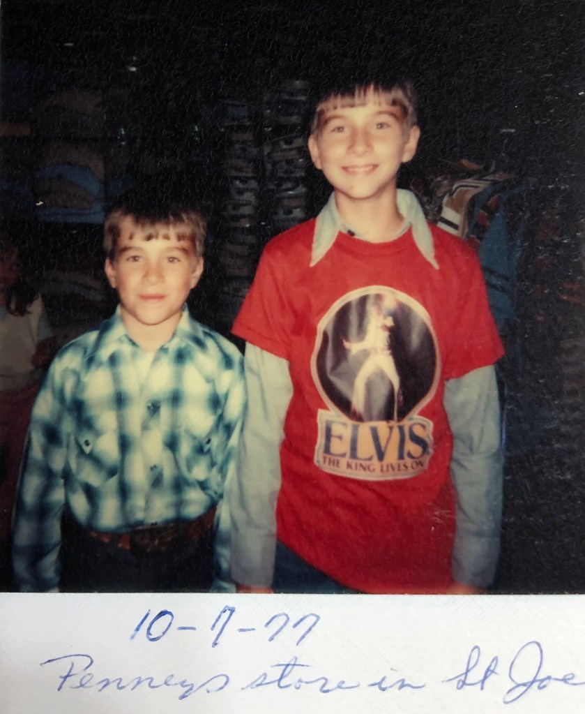 I’ve been an Elvis fan since the first time I heard “That’s All Right” and I remember watching in awe his TV special Aloha from Hawai’i via Satellite in 1973. His Aloha from Hawai’i show stands as one of his best live performances, along with the 1968 Comeback special on NBC. My mother, also an Elvis fan, bought me an Elvis t-shirt shortly after he passed. I remember that I endured a good bit of bullying for wearing this shirt to school and was taunted with insults from other kids like “He’s dead!”, “King of nothing!”, and “Nobody cares about Elvis!” to just name a few. But I persevered and continued to wear my Elvis t-shirt with pride. This is the only picture I have of me wearing the shirt and it was taken in the J.C. Penneys store in St. Joseph, Missouri in October 1977 (as my mother’s handwriting describes). It was taken with a Polaroid Instant Camera. The sales clerk was trying to talk my parents into buying the latest, greatest camera to be invented and took this picture of my brother and I as a sample/reward for listening to his sales pitch. My parents did end up buying one about six months later!